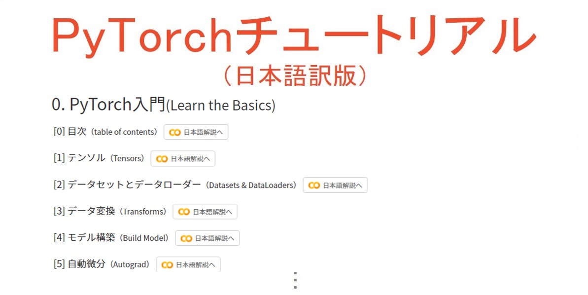 PyTorch公式チュートリアルの日本語翻訳版です。PyTorch入門として、PyTorchを初めて学ぶ初心者、中級者の方におすすめです。